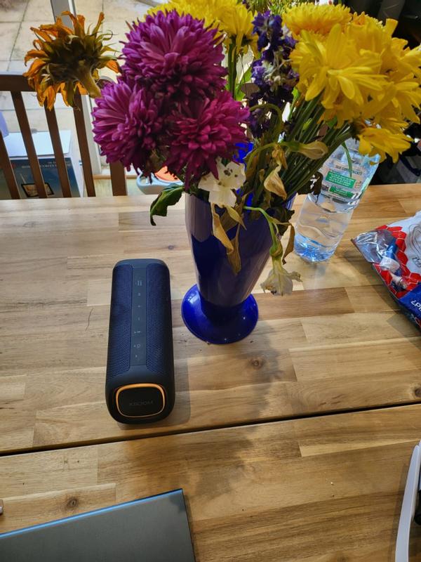 Really enjoying my music with this speaker. Great sound. Great bass. Crisp and clear notes. The app is real easy. The battery lasts and lasts. Great purchase
