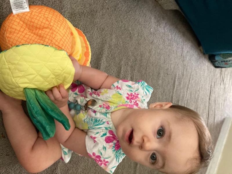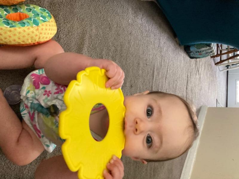 My 9month old loves this toy! She gravitates toward it out of all her toys! She especially loves chewing on the leaves at the top--they have that baby paper sound and texture. She also loves the pineapple slice in the middle that is more of a teething material!