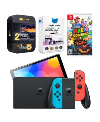 Switch Neon Red & Blue OLED Console with Super Mario 3D World + Bowser s Fury, MightySkins Console and Controller Skin Voucher, and 2 Year CPS Extended Warranty