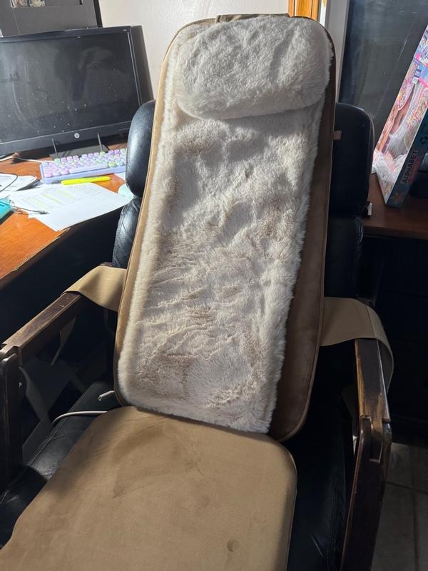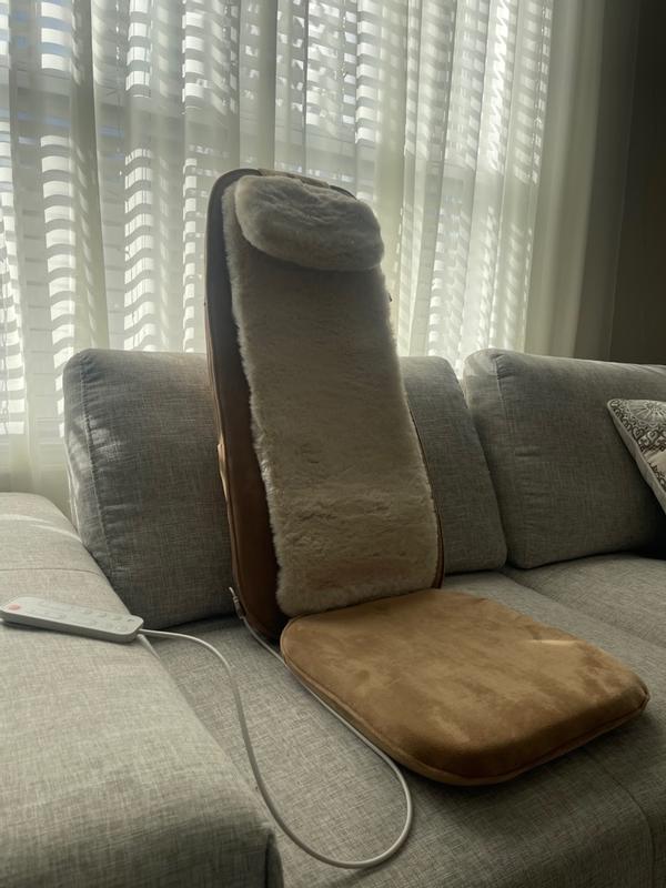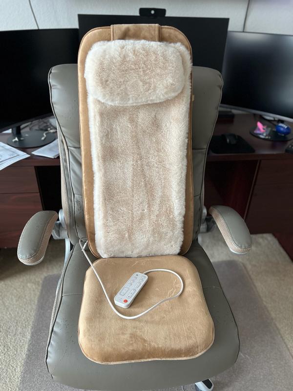 I have never had a massager like this before, where you can just sit and do nothing while the cushion does everything by itself. My back gets very tired during the day, and I often experience lower back pain, so this device turned out to be very helpful. It was packed in a cardboard box, and the cushion itself is quite sturdy and heavy, made from a very pleasant material. The artificial fur is very soft and nice to the touch. It charges quickly and comes with a remote control that is attached to the cover with a wire, which is very convenient and prevents it from getting lost. The charge lasts for 70 minutes of continuous use. The cushion has four rollers that can massage the entire back, or you can set it to work on specific areas. There is also a heating mode; when it’s turned on, the rollers light up red, and without this mode, they are not illuminated. The massager works well; at first, it was a bit painful, but my back got used to it, and it no longer hurts. Instead, it feels very pleasant, relaxing, and it kneads all the areas from the neck to the lower back. The massager is quite compact, making it easy to store under the bed. I really liked the massager; it perfectly replaces a live masseuse at an affordable price.