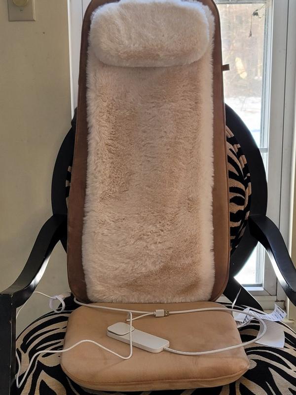 This Sharper Image Cushion massager's outter matterial is so soft. It has the versability to be used in a chair, on the floor, in a bed or in a car. It is easily charged with a USB that is included, but the charging block is not. The attached photo shows it lying flat on the floor. I found this uncomfortable, but I didn't spend time using pillows to get that perfect adjustment. It works best on the mid and low back while in a comfortable chair. It did a decent job at getting into the knots and helping to reduce sore muscles. The instruction manual is pretty much useless. We learned that it doesn't work while charging. There is a heat setting but there is no heat or warmth although it would be a nice feature. This is definitely not a replacement for a traditional massage nor does it do anything for the neck, but it does give a nice massage and gently loosen tight muscles.
